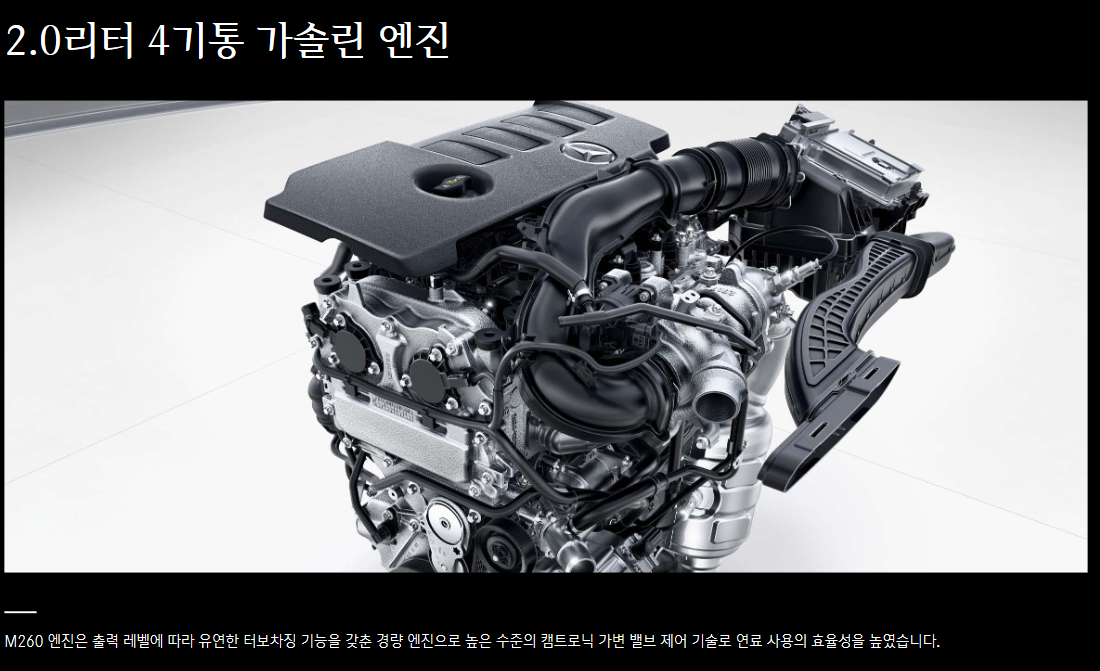 2.0리터 M260 4기통 가솔린 엔진이 장탁되어 있습니다. 출력 레벨에 따라 유연한 터보차징 기능을 갖춘 경량 엔진입니다.