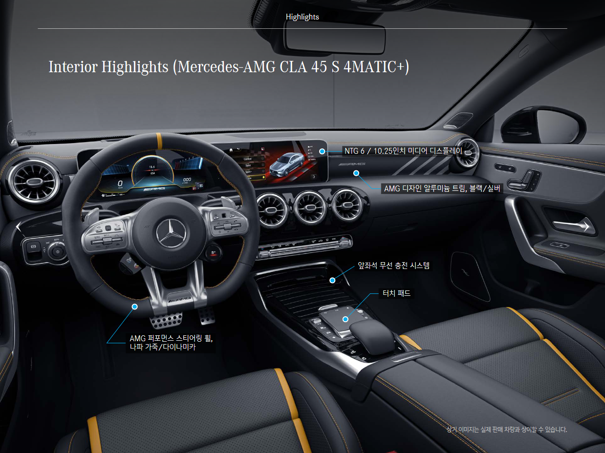 외관은 AMG 파나메리카나 그릴, 멀티빔 LED, AMG 고성능 브레이크 시스템 (프론트 6 피스톤), 19인치 AMG 크로스 스포크 단조 휠, 파노라믹 선루프, 리어 스포일러, 듀얼 트윈 머플러가 특징입니다. 인테리어는 AMG 퍼포먼스 스티어링 휠, NTG 6 / 10.25인치 미디어 디스플레이, AMG 디자인 알루미늄 트림, 앞좌석 무선 충전 시스템, 터치패드가 특징입니다.